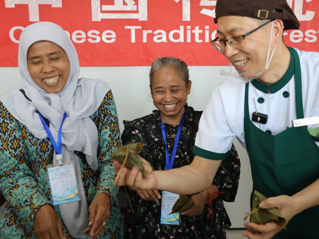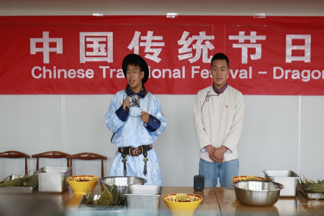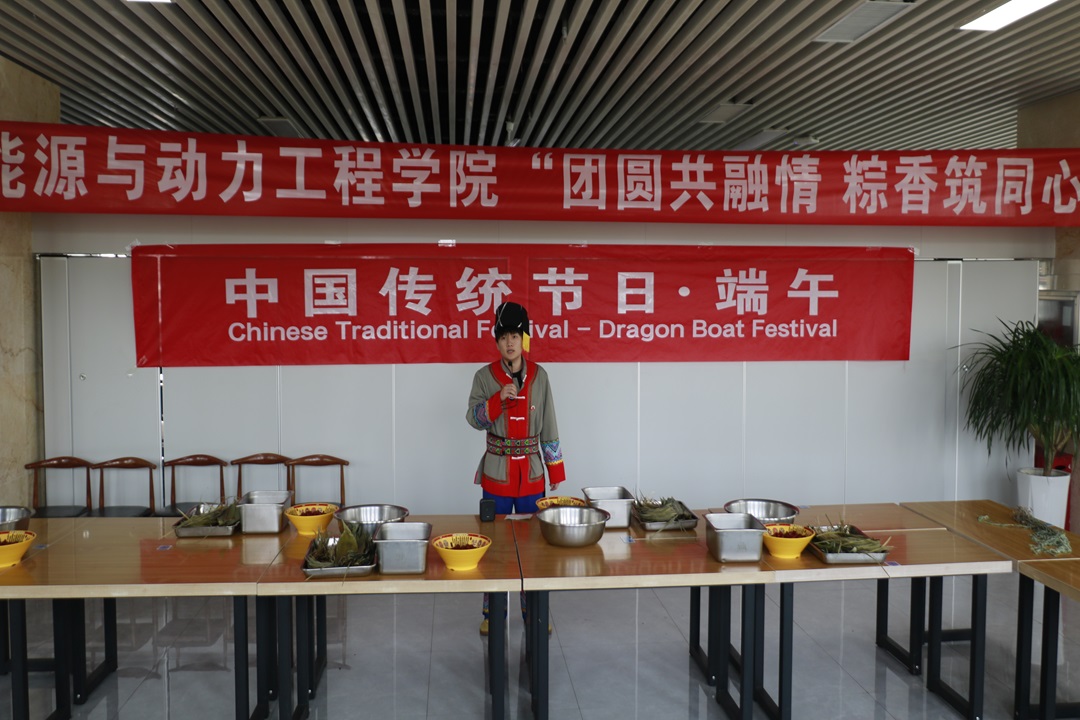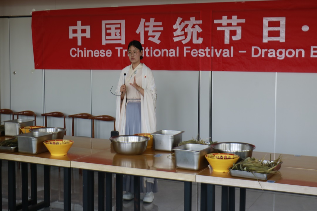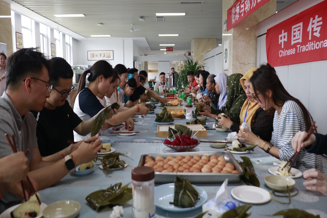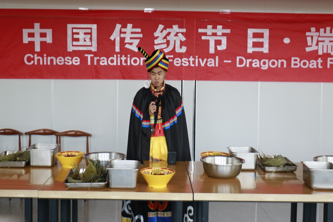 活动现场,同学们向培训班的国外专家学员介绍了端午节悠久的历史和丰富的文化内涵。回族、布依族、土家族、蒙古族、彝族、锡伯族、汉族同学身着民族服饰,讲解民族特色活动、美食。