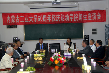 金秋时节硕果累累,工程技术楼前花团锦簇,鲜艳的彩旗迎风招展,到处洋溢着节日的气氛。2011年9月16日下午3:00时,永利官网60周年校庆能动学院师生座谈会在工程技术楼A座208投影室隆重举行,出席座谈会的有内蒙古工学院老院长李希玉教授、永利官网原校长孟昭昕教授、内蒙古工学院动力系原系主任姜芝藩教授、退休老教师杨雷教授、孙佩忠教授、方福来教授、樊万本教授、原动力系副主任应鸿安副教授等、返校参加校庆活动的各级校友及部分教师代表,能动学院院长汪建文教授主持会议。