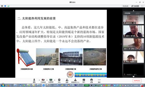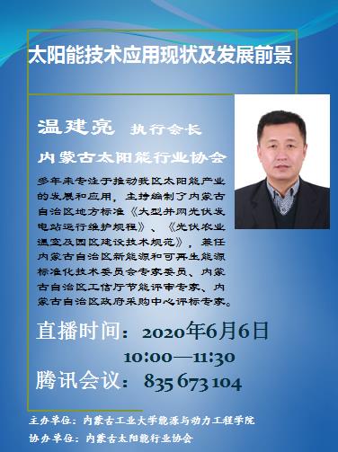 6月6日上午,新能源科学与工程系邀请内蒙古太阳能行业协会执行会长温建亮作了题为“太阳能技术现状及发展前景”讲座。讲座通过腾讯会议方式进行。