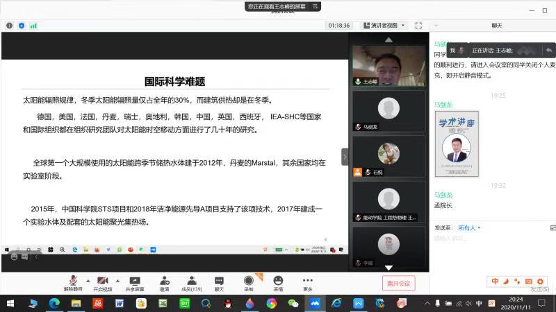 2020年11月11日晚,中国科学院电工研究所研究员、博士生导师、国务院津贴获得者王志峰教授受邀通过腾讯会议线上为我院师生做了题为《太阳能聚光新技术及跨季节储热技术》的学术报告。本次报告会由304永利集团热能工程系系主任马剑龙教授主持。