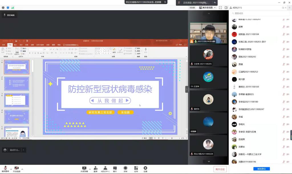 党支部负责人朱恒鹏同学介绍了新冠肺炎防控的相关知识、疫情的最新动态和阻断新冠病毒传播的主要途径,号召全体同学遵守所在地区防疫要求,减少人员流动,协助当地防疫部门完成核酸检测等相关工作。