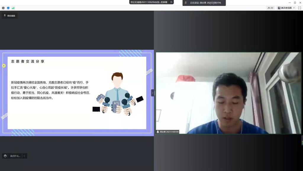 会上,党支部邢志泰和牛大川同学分享了自己作为抗疫志愿者的感悟。邢志泰同学表示,作为一名党员要牢记使命,主动响应号召,为疫情防控贡献自己的力量。疫情防控离不开众多工作人员的默默付出,疫情无情人有情,让我们共同努力筑牢疫情防线。牛大川同学表示,作为一名在校研究生和中共预备党员,应积极响应当地的抗疫工作,希望山河无恙,人间皆安,疫情结束,英雄长生。