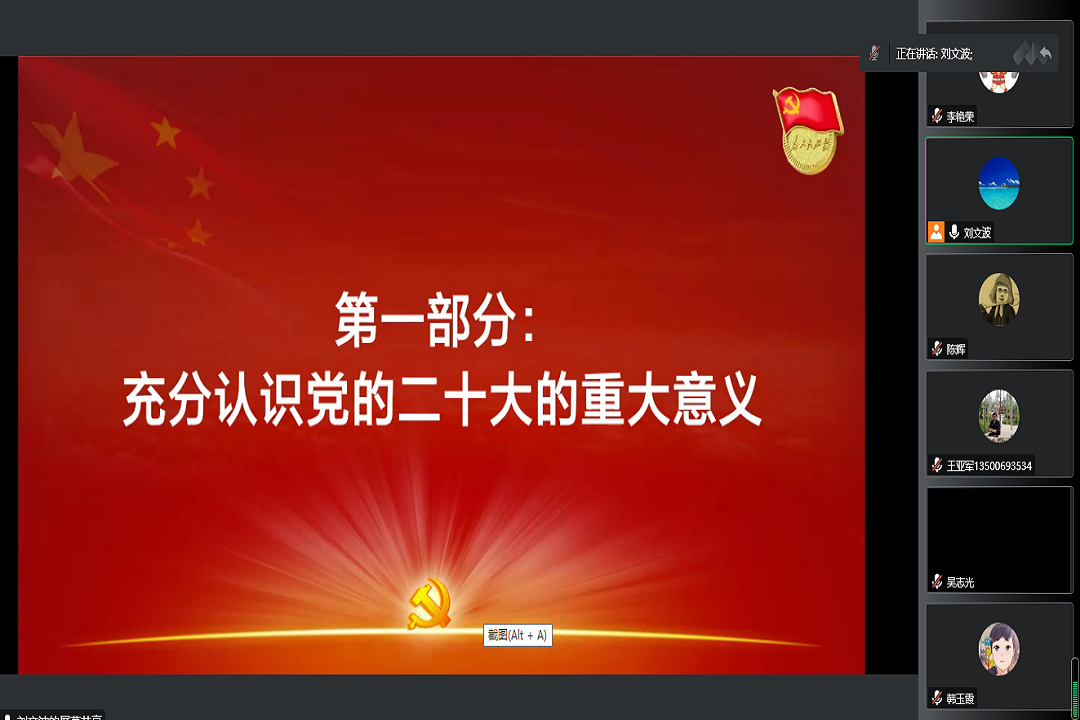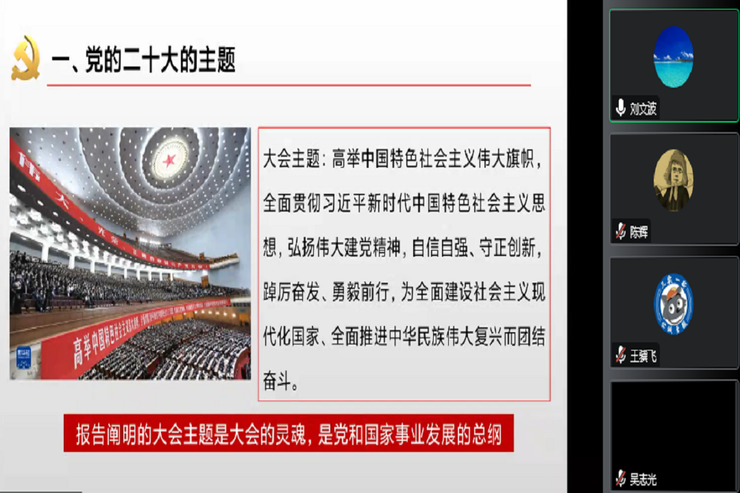 刘文波副教授围绕充分认识党的二十大的重大意义、全面准确学习领会党的二十大精神、全面学习、全面把握、全面落实,推动党的二十大精神落地生根、开花结果三个方面对大会召开的时间节点和时代背景的重要性、党的二十大的主题、过去5年工作和新时代10年的伟大变革、马克思主义中国化时代化、中国式现代化、全面建设社会主义现代化国家的目标任务、坚持党的全面领导和全面从严治党,应对风险挑战等多方面对党的二十大精神作了全面宣讲和深入阐释。