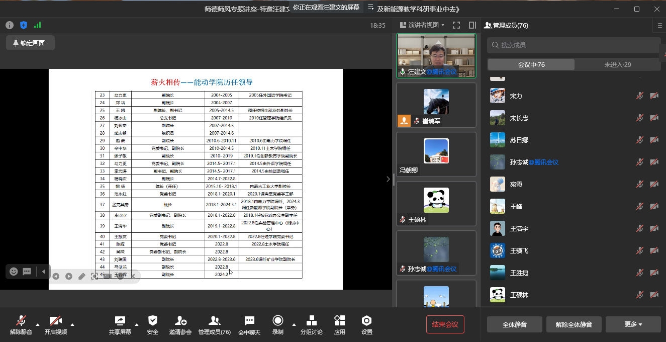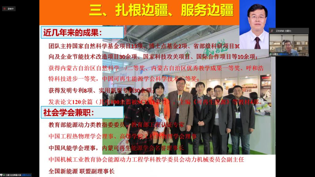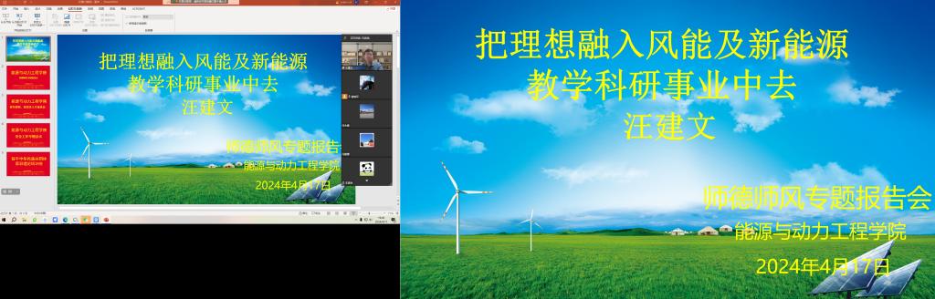 4月17日晚,学院在线上举行师德师风专题讲座,特邀汪建文教授以“把理想融入风能及新能源教学科研事业中去”为主题,与全院教职工共同探讨和分享教学科研的深层次内涵。此次讲座旨在进一步强化我院的师德师风建设,深入践行社会主义核心价值观,激励教师们自觉提升师德修养,积极投身于教书育人的伟大事业中,传承和发扬能动精神。