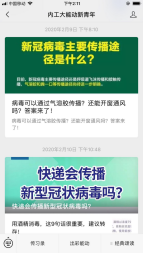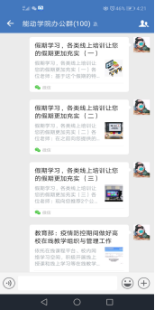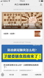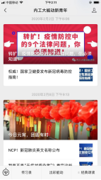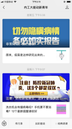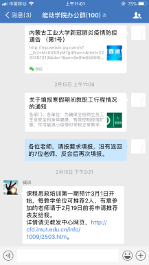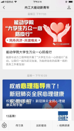 通过各班级微信群及“内工大能动新青年”微信平台上发布了学校“致全体学生和家长的一封信”等信息,及时通告学校相关工作安排,解答学生的相关问题,安抚学生由疫情造成的烦躁情绪。通过微信平台推送疫情防护知识、假期计划和官方发布的疫情进展情况,帮助学生提高自我防护能力,及时了解疫情发展情况。