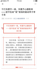 疫情当前,很多学生党员主动参与居住地社区、村(嘎查)党员志愿服务活动,承担相应工作,传播科学知识,积极弘扬正能量。我院有62名志愿者在防控疫情工作的第一线,学院在“内工大能动新青年”微信平台上对他们的事迹进行了系列报道。